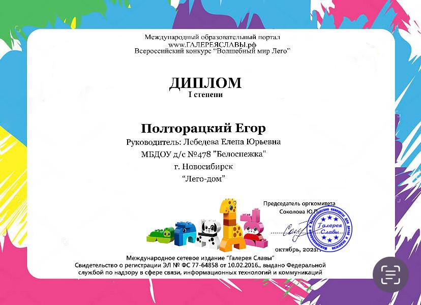 Диплом 1 место во всероссийском конкурсе "Волшебный мир Лего" 10.11.2025