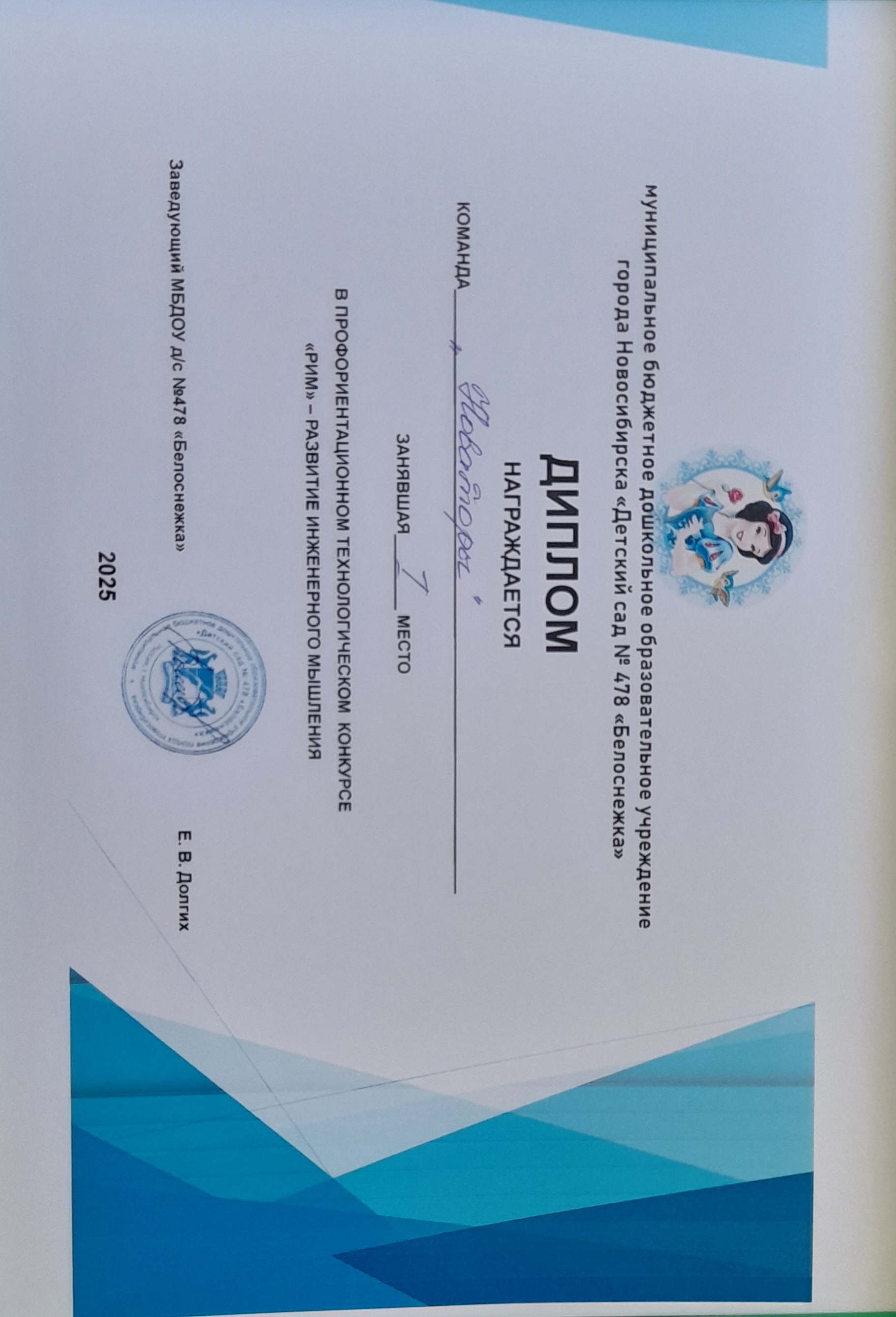 Диплом 1-е место в профориентационном технологическом конкурсе "РИМ"- развитие инженерного мышления. 2025 г.
