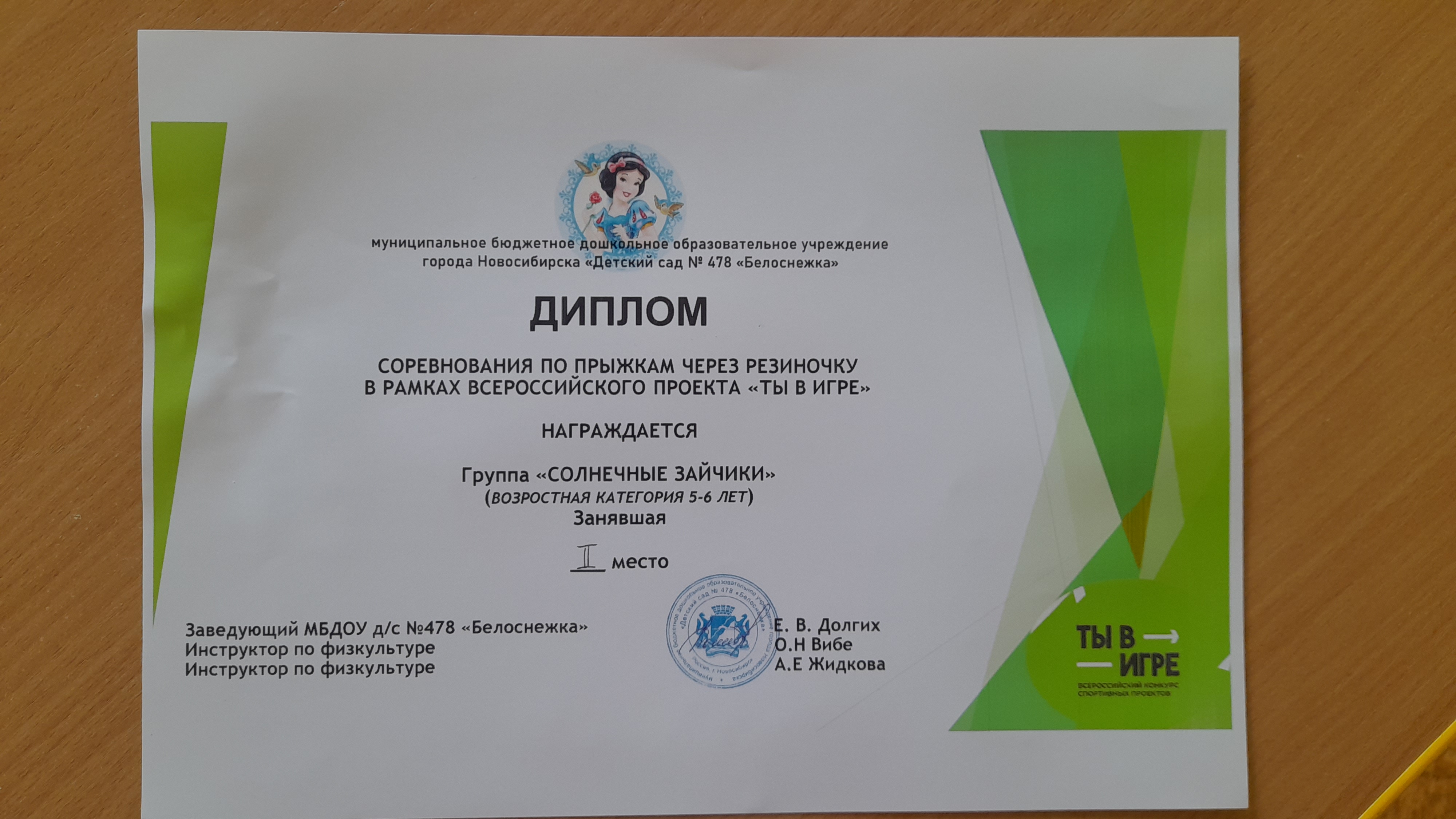 Диплом 2-е место в соревнованиях по прыжкам через резиночку в рамках всероссийского проекта "Ты в игре". 2025 г.