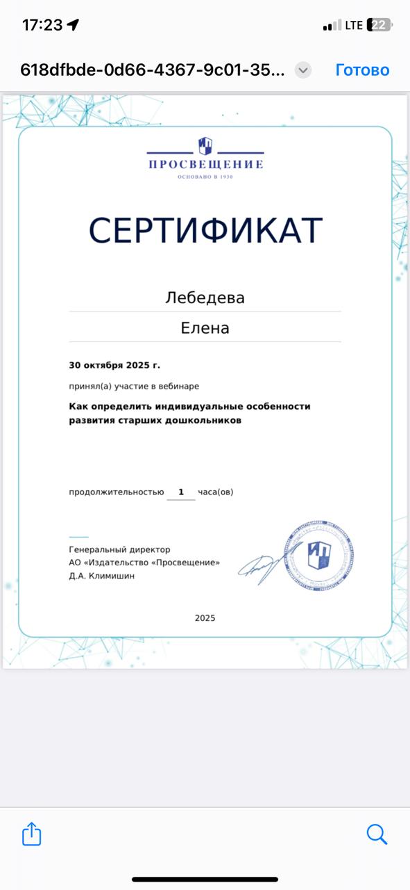 Сертификат участника вебинара "Как определить индивидуальные особенности развития старших дошкольников" 30.10.2025