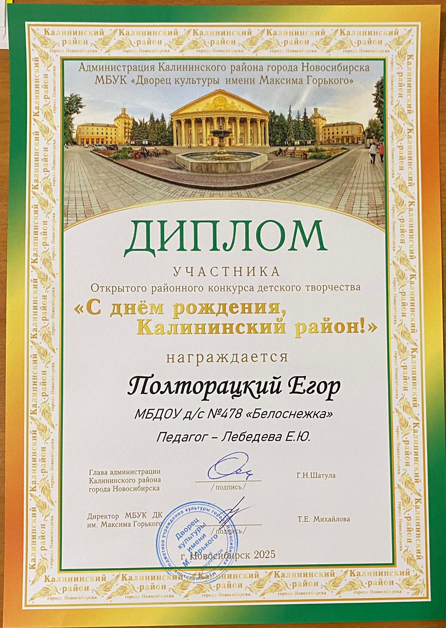 Диплом участника открытого районного конкурса детского творчества "С днем рождения, Калининский район!" 2025г.